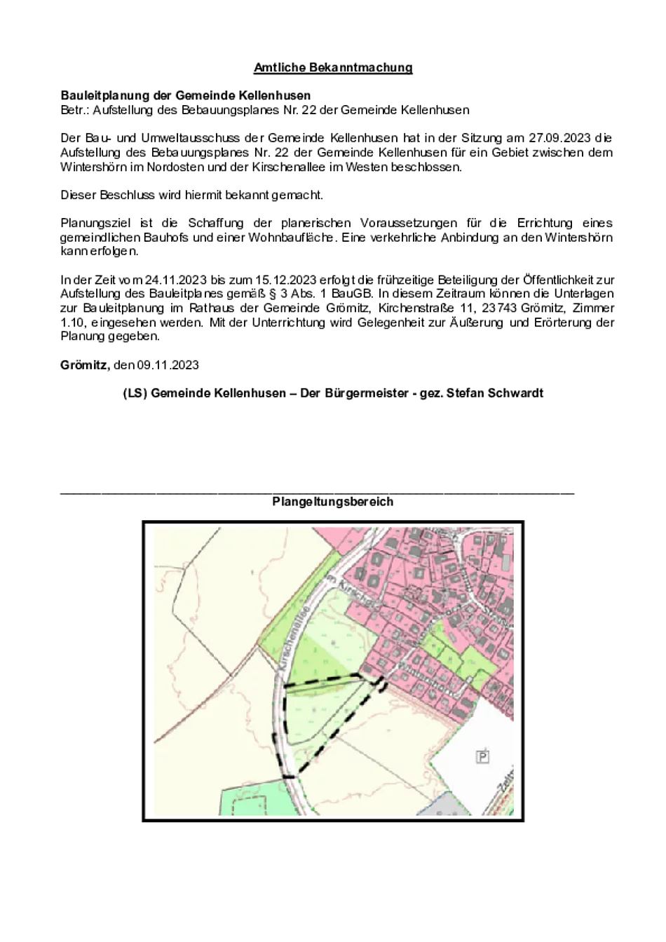 Amtliche Bekanntmachung - Aufstellung des Bebauungsplanes Nr. 22 der Gemeinde Kellenhusen