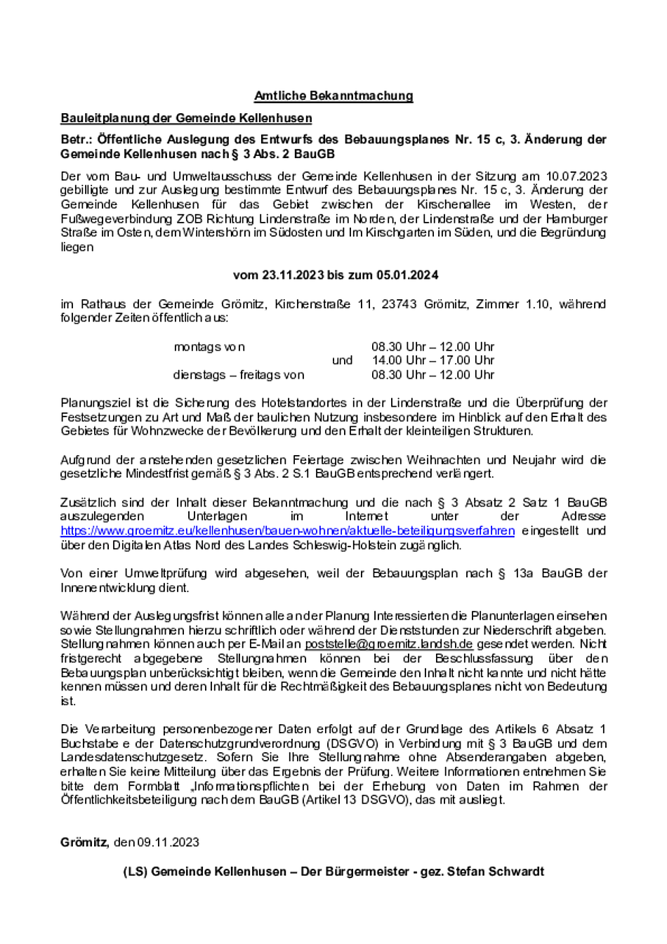 Amtliche Bekanntmachung - Entwurf des Bebauungsplanes Nr. 15 c, 3. Änderung der Gemeinde Kellenhusen