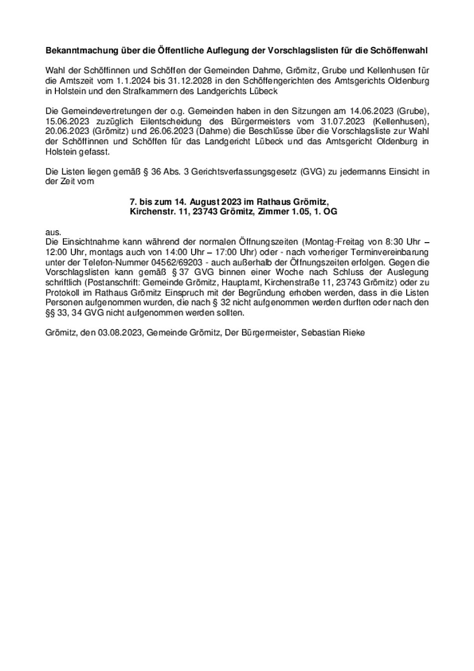 Die Gemeindevertretungen der o.g. Gemeinden haben in den Sitzungen am 14.06.2023 (Grube), 15.06.2023 zuzüglich Eilentscheidung des Bürgermeisters vom 31.07.2023 (Kellenhusen), 20.06.2023 (Grömitz) und 26.06.2023 (Dahme) die Beschlüsse über die Vorschlagsliste zur Wahl der Schöffinnen und Schöffen für das Landgericht Lübeck und das Amtsgericht Oldenburg in Holstein gefasst.